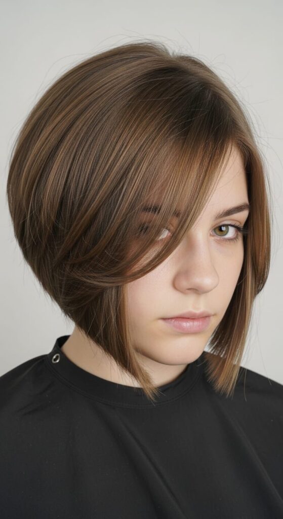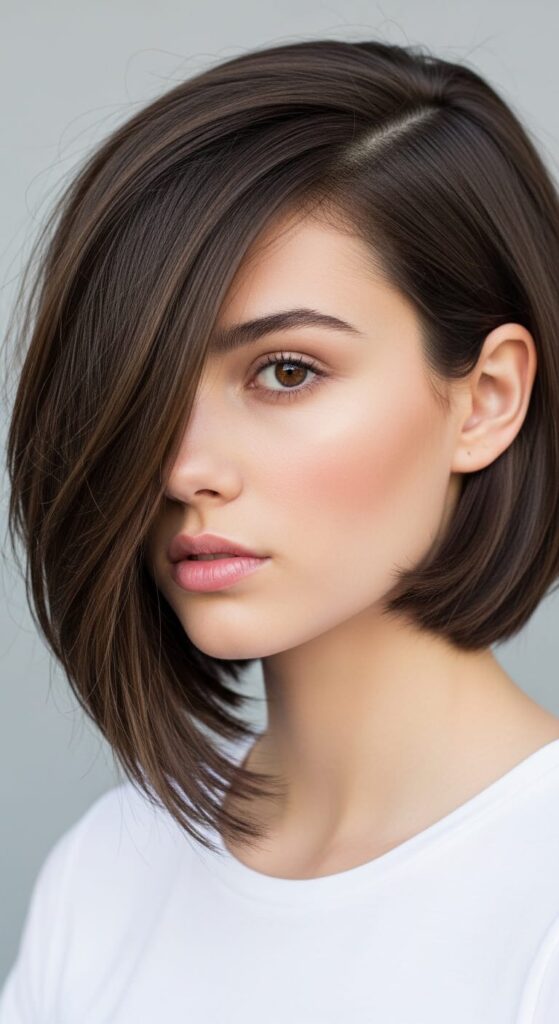 One side longer than the other — sounds like a lot but it usually isn’t. Layers on both sides keep it from looking stiff or too dramatic. The diagonal line draws the eye across the face in a flattering way. It’s a statement cut that photographs really well.