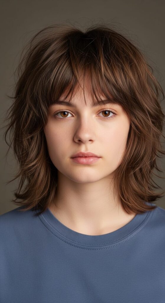Lots of layers at different lengths with wispy ends and a tousled, relaxed finish. Has that effortless energy that looks like you did nothing but somehow still looks good. Works on straight, wavy, and lightly curly hair — thick hair gets the best shaggy effect. Air-dries really well with just a texturizing spray.