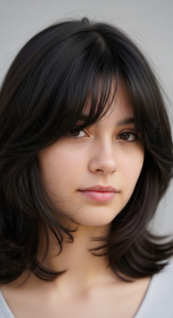 Bangs split down the middle and blend into the front layers like one seamless cut. Has a soft, slightly vintage feel that works without being overdone. Great for round or square faces because the center part adds length. Grows out cleanly — no awkward in-between phase.