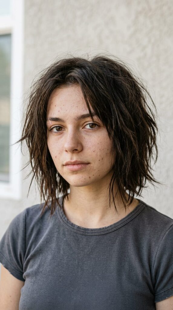 Uneven, broken ends that give the hair a cool, intentionally undone look. Not neat — and that’s exactly what makes it work. The vibe is casual and confident without trying too hard. Fine hair needs a texturizing spray to keep the piecy effect defined.